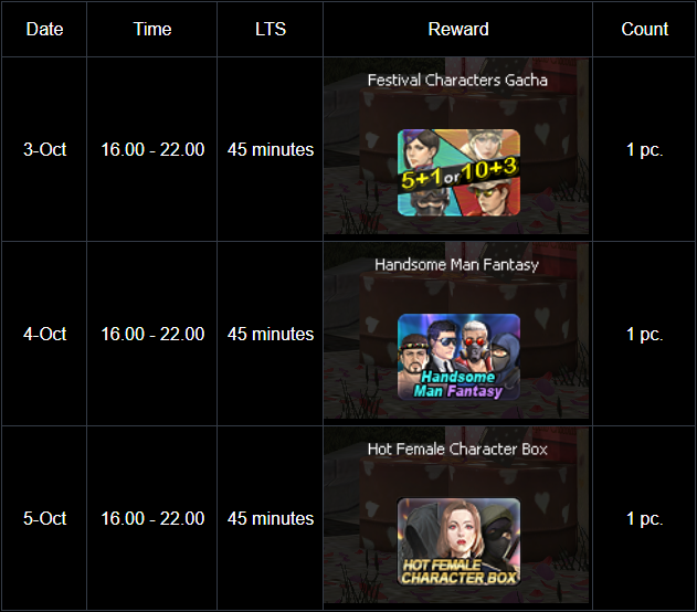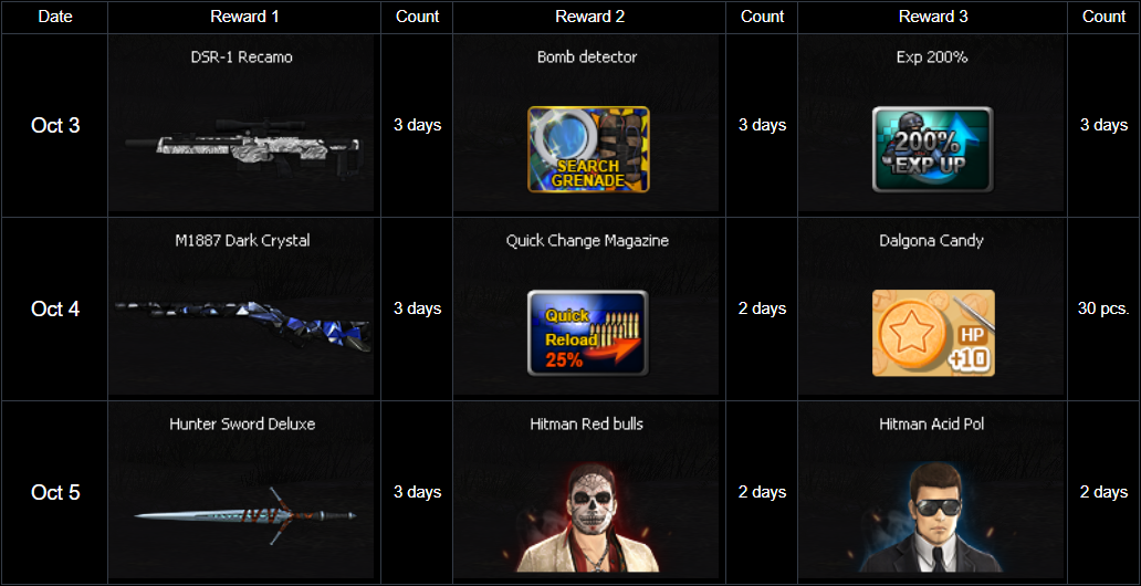 POINT BLANK EVENT UPDATE October 1, 2025 Patch Note Highlights 1. Don't miss! Battle Pass: Astel will be available for last week! See more details here. 2. STILL OPEN! The September Gold Ticket Shop ready to exchange! See more details here. 3. Character Rebalance event! Try out the reinforced character from event participation! See more details here. 4. NEW EVENT! Pirate Ticket Collection Event starting now!! See more details here. New in-game events New! Mission Card: Grave! (October 1 - 21, 2025) New! Weekend Special Login Event (October 3 - 5, 2025) New! Weekend Login Time Spend Event (October 3 - 5, 2025) New! October Attendance (October 1 - 20, 2025) Ongoing events - Welcome New Player Event (September 17 - October 7, 2025) - Daily Login Event (September 17 - October 7, 2025) - RANK UP Event (September 17 - October 7, 2025) - Weekday Login Time Spend Event (September 29 - October 2, 2025) - September Come back Attendance (September 17 - October 7, 2025) Demon Hunter Series Sale period : October 1 - 7, 2025. (Items will be available until the server maintenance period.) Use the series' main weapon to receive a special EXP & Point bonus of 150% during the event (Bonus period: October 1 - 7, 2025) ![]() Arcade Gacha V2 Sale period : October 1 - 14, 2025. ![]() ![]() *The image shows only some of the items. Players can check all the rewards from the in-game shop. (Items will be available until the server maintenance period.) AUG HBAR Element Nature Pack Sale period : October 1 - 14, 2025. (Items will be available until the server maintenance period) ![]() ![]() ![]() New User Event Event period: September 17 - October 7, 2025 New Player who signs up and enters the game according to the event date and time will receive the following prizes: ================== Daily Login Event Event period: September 17 - October 7, 2025 Player who online in game for the determined dates and times. Received "Exclusive items" for Free! ![]() * All items from the event have a 1-day expiration* **The items will be activated immediately upon entering the character or being in the player's inventory.** ![]() Mission Card: Grave! Event period: October 1 - 21, 2025 Introducing the special Mission Card for Pirate Token Collection event, which comes with a variety of mission & items reward: ![]() Rewards available from the Mission card: Grave! ![]() ![]() ![]() ![]() ![]() ![]() ![]() ![]() After completing all mission card, you will receive Pirate Ticket for Reward Collection Event You can view the full details of mission tasks & rewards: CLICK HERE Weekend Special Login! Event Period: October 3 - 5, 2025 Player who login to the game on weekend will receive the "Exclusive items" for Free! ========================= Weekend Login Time Spend Event Event Period: September 3 - 5, 2025 Simply log in and accumulate the required number of online hours during the "Event Period" to receive the following rewards. ![]() ========================= September 2025 Weekday Login Time Spend Event Event Period: September 29 - October 2, 2025 Simply log in and accumulate the required number of online hours during the "Event Period" to receive the following rewards. ![]() ![]() ========================= RANK UP EVENT Event Period: September 17 - October 7, 2025 During the event period, the rank up reward will be increased for limit. Get your rank up and receive the special reward! Rank 1 - 16 Rank 36 - 45 ========================= ![]() October 2025 Attendance Login Event Schedule Event Period: October 1 - 20 2025 Just log in to the game during the event to receive the following items. ![]() ========================= September 2025 Come back! Attendance Login Event Schedule For trooper who didn't login between July 1,2025 to September 16, 2025 enter the game and check your attendance during the event to receive the prizes listed below! ![]() ![]() EXP & Point Bonus Table for October 2025 ![]() ![]() |