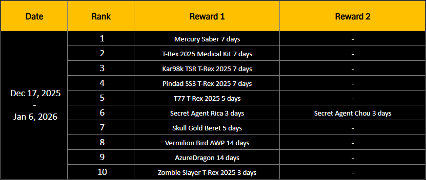 * Special quest (Red text) is required PB Cash to activate the quest - Daily Quest: 600 PB Cash - Weekly Quest: 1000 PB Cash ========================= Login Time Spend Event Event period : December 19 - 21, 2025. Simply log in and accumulate the required number of online hours during the "Event Period" to receive the following rewards. ![]() ![]() ![]() ========================= Rank Up Event! Event period : December 17, 2025 - January 6, 2026. Simply by logging into the game and advancing your rank, players can receive additional exclusive rewards during Ranks 1 - 10, as follows: