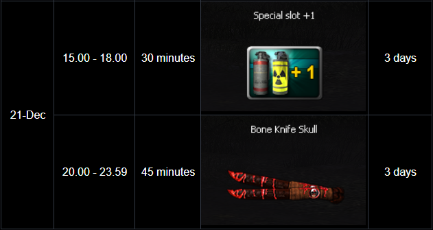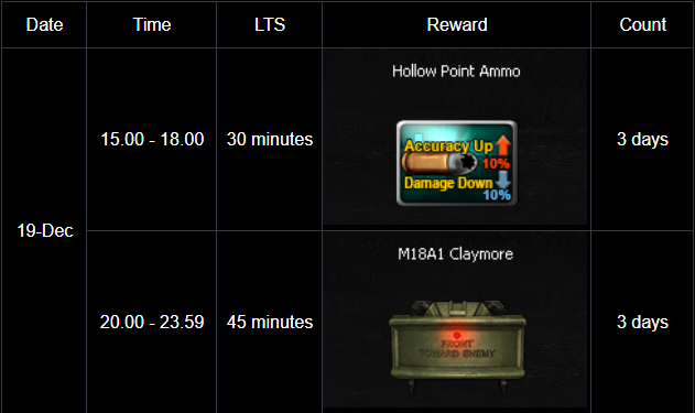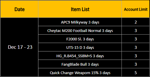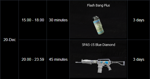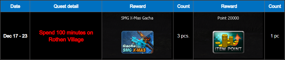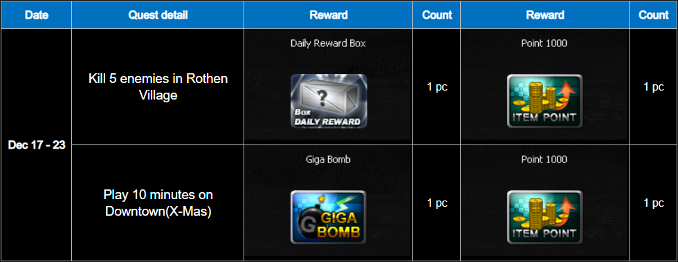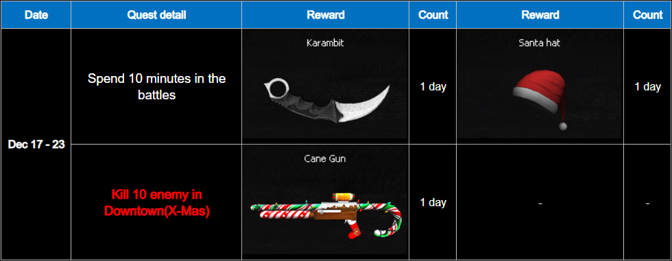 ========================= Winter Mission Event period : December 17 - 23, 2025 Special daily and weekly missions available only on winter-themed maps! Receive a special weapon and a random box upon mission completion. Daily Quest ![]() ** Reward items with a duration will be activated immediately upon receive. Weekly Quest