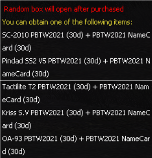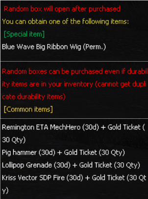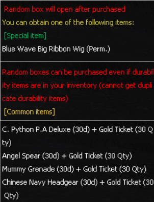 ![]() PBTW Series Gacha Sale period : December 17 - 30, 2025. ![]() ![]() *The image shows only some of the items. Players can check all the rewards from the in-game shop. (Items will be available until the server maintenance period.) ============================ BlueWave BigRibbon DuraBox Sale period : December 17 - 30, 2025. ![]() New Permanent Wig Random box! Blue Wave Big Ribbon Wig with 2 special random boxes. Both boxes come with different drop rate and price!