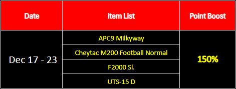 Use the series' main weapon to receive a special EXP & Point bonus of 150% during the event (Bonus period: December 17- 23, 2025) ========================== Limited Point Item Sale Sale period : December 17 - 23, 2025 Opening for new limited item sale which can be purchase via Point for all players! You can purchase more item more comfortable. List of special discount item for limited time can be purchase with Point