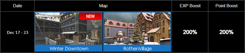 Winter Map Event Event period : December 17 - 23, 2025 Special daily missions available only on winter-themed maps! Receive a special Point Items upon mission completion! ![]() When playing winter-themed maps according to the following schedule, you will receive an additional EXP and Point Boost of up to 200%.