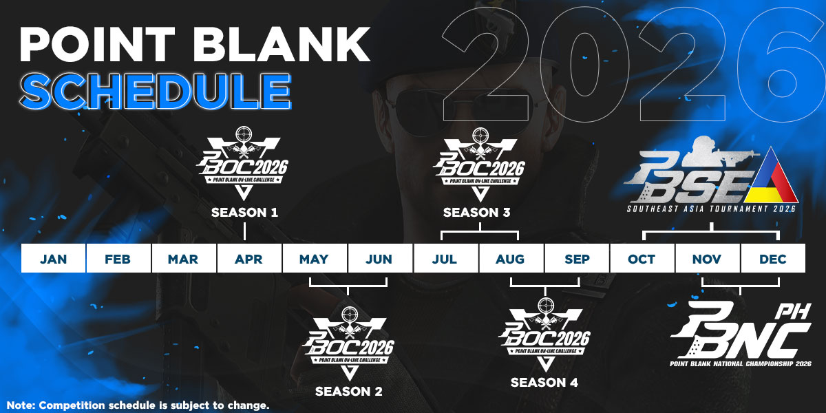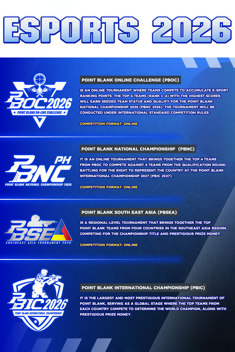 POINT BLANK TOUR ROAD MAP 2026 Get ready for official tournaments throughout 2026! Open to players of all levels, from amateurs to professionals. Step onto the battlefield and prove your skills in intense competitions. 🏆 It’s time to gather your team, enter the fight, and rise on the official competitive stage. Don’t miss the biggest opportunity of the year! Team and Character Name Change Regulations 1.Teams are allowed to modify their player line-up only during the registration period. Once the registration period has ended, no player changes will be permitted under any circumstances. 2.Team names must remain unchanged throughout the entire competition year. Teams may add additional text after the team name; however, the main team name must remain the same. 3.In-game Character Names must not be changed throughout the duration of the competition. If any changes to the team name or in-game character name are found, the organizing committee reserves the right to disqualify the team or deduct points at its sole discretion.
