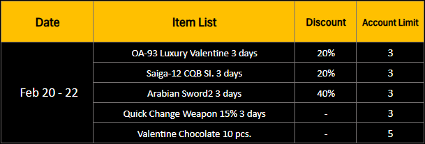 Use the series' main weapon to receive a special EXP & Point bonus of 150% during the event (Bonus period: February 18 - 24, 2025) ========================== Limited Point Item Sale Sale period : February 20 - 22, 2026. Opening for new limited item sale which can be purchase via Point for all players! You can purchase more item more comfortable. List of special discount item for limited time can be purchase with Point