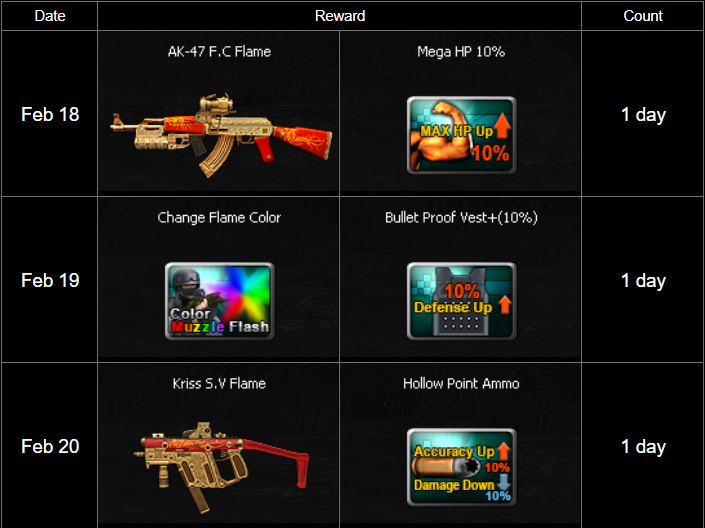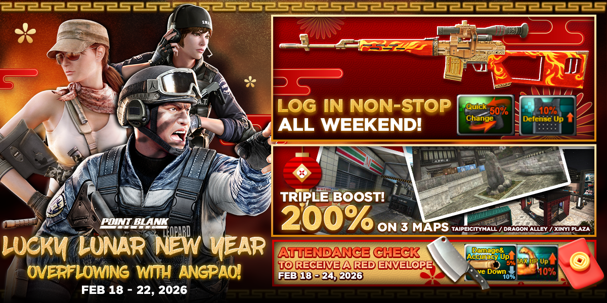 Special Lunar New Year Event Event period : February 18 - 24, 2026 🧧 Celebrate Lunar New Year with Point Blank! 🧧 Wishing you a prosperous and lucky Year of 2026! We’re kicking off the festivities with a mountain of rewards waiting to be claimed. Join the celebration and grab your share of the fortune today! List of In-game event Special Mission - Mission Card: Lunar New Year! (February 18 - 24, 2026) - Lunar New Year Login (February 18 - 22, 2026) - Lunar New Year Login Time Event (February 20 - 22, 2026) - Lunar New Year Map EXP & Point Boost (February 18 - 22, 2026)
