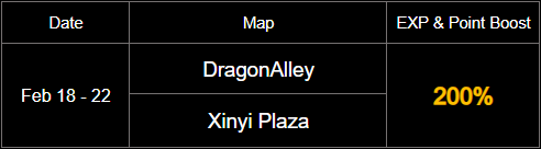 =========================== Lunar New Year Map EXP & Point Boost Event period : February 18 - 22, 2026 Play during the weekend to receive an EXP and Point boost of up to 200% on Chinese theme map!