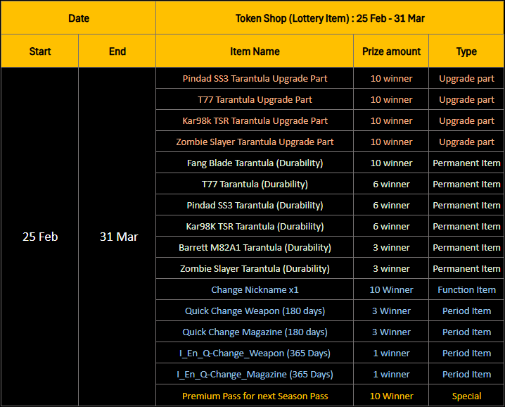 Note: For more details regarding item durations and prices, please check the Token Shop directly. =========================== 🎟️ Lucky Draw Item Shop Lucky Draw entries will be available for purchase starting from February 25, 2026. These entries will be available until March 31, 2026. Purchasing an entry grants a chance to win the prize only. Rewards are not guaranteed for every purchase in any case.