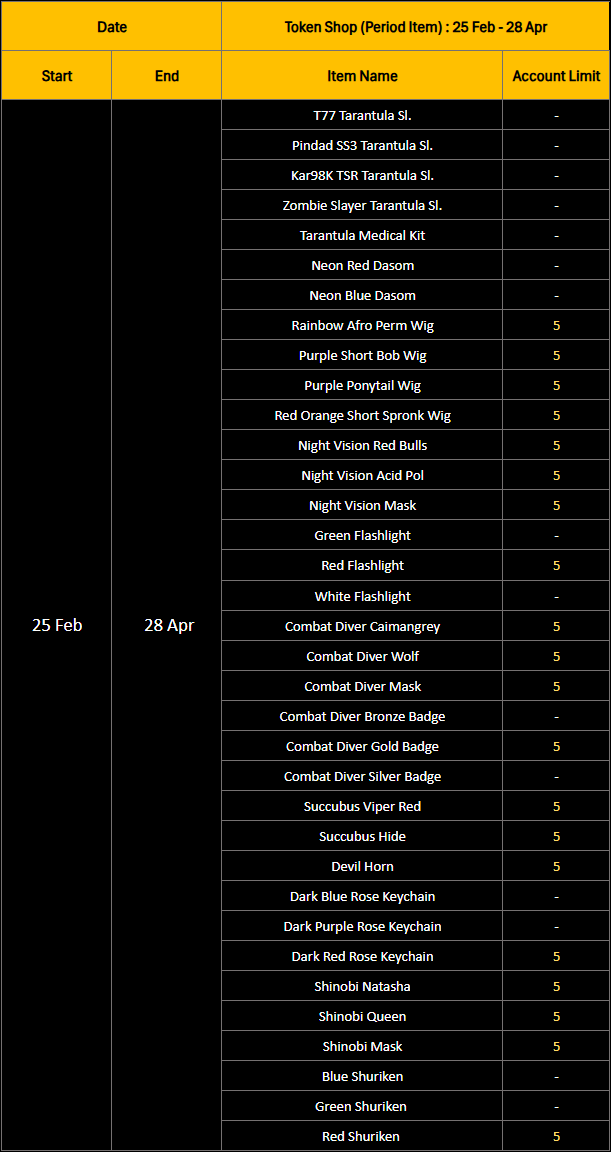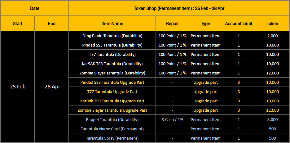 💎 Permanent Item Shop!! All permanent items will be available for purchase starting from February 25, 2026. These items will be on sale for a limited time only, until April 28, 2026. ===== PBIC Token Permanent Item Shop: Item Highlights ===== 🛠️ Upgrade Part System The new Upgrade Part System allows you to enhance your weapons through the following tiers: Normal > Silver > Gold As your weapon grade increases, the repair cost will be adjusted accordingly: 100 > 200 > 300 Points / 1% Note: Full details regarding the Upgrade Part System will be announced soon. Please stay tuned for further updates on our Official Fanpage and Website. =========================== ⏳ Period Item Shop!! All period items will be available for purchase starting from February 25, 2026. These items will be available until April 28, 2026.