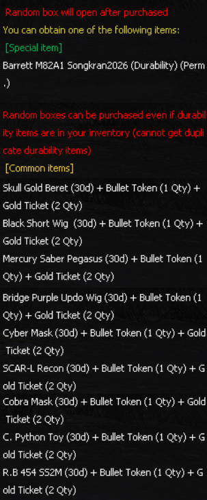 For each "Barrett M82A1 Songkran26 Dura Box" opened, player will receive 1 Bullet Token and 2 Gold Ticket
