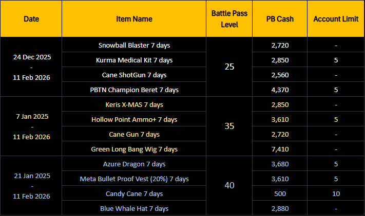 Season Pass Period:  December 24th, 2025 - February 11th, 2026