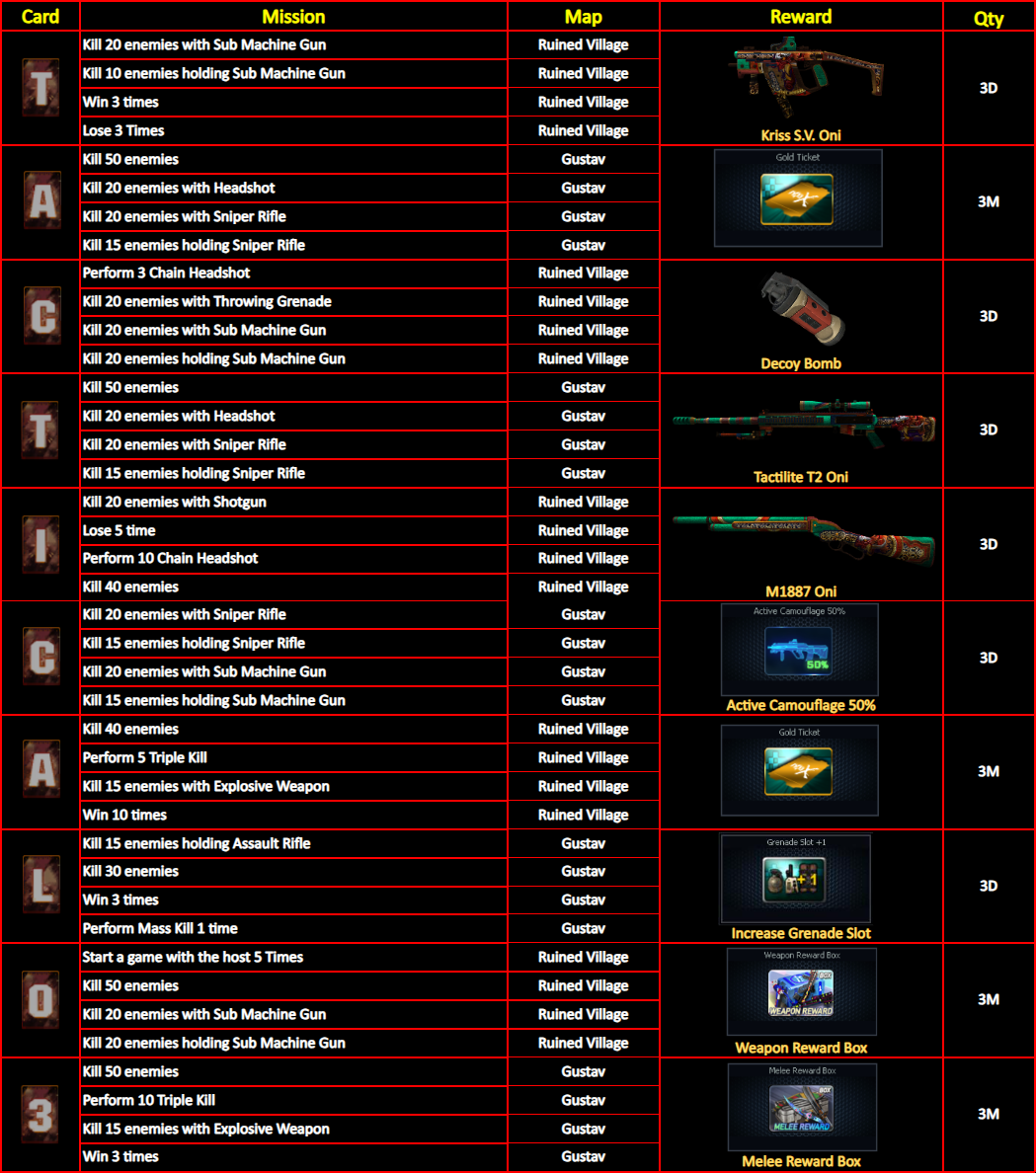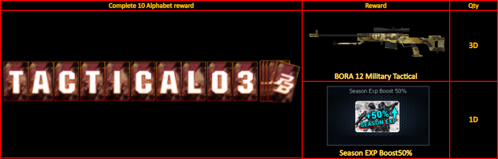 Event Period : October 4 -17 , 2023 Trooper, who complete missions according to conditions will receive a great prize as the following ![]() Exclusive reward for the participants who collected all the alphabet from Mission Card. ![]() |