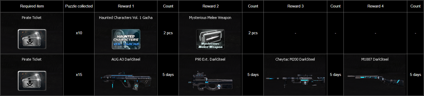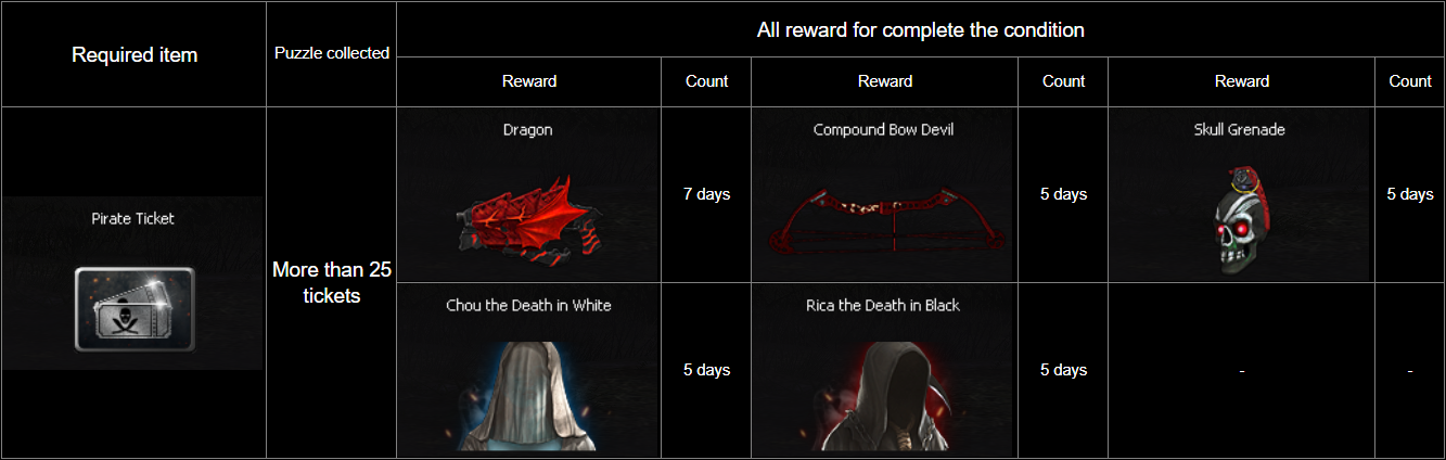 10. Pirate Ticket Collection reward list after collect the amount of the tickets!
