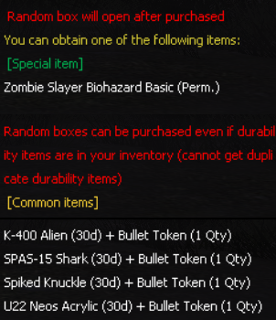 Players must collect 800 Bullet Tokens for guarantee the "Zombie Slayer Biohazard Basic (Durability)".