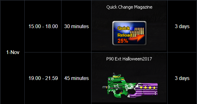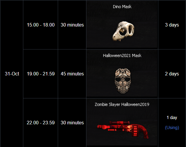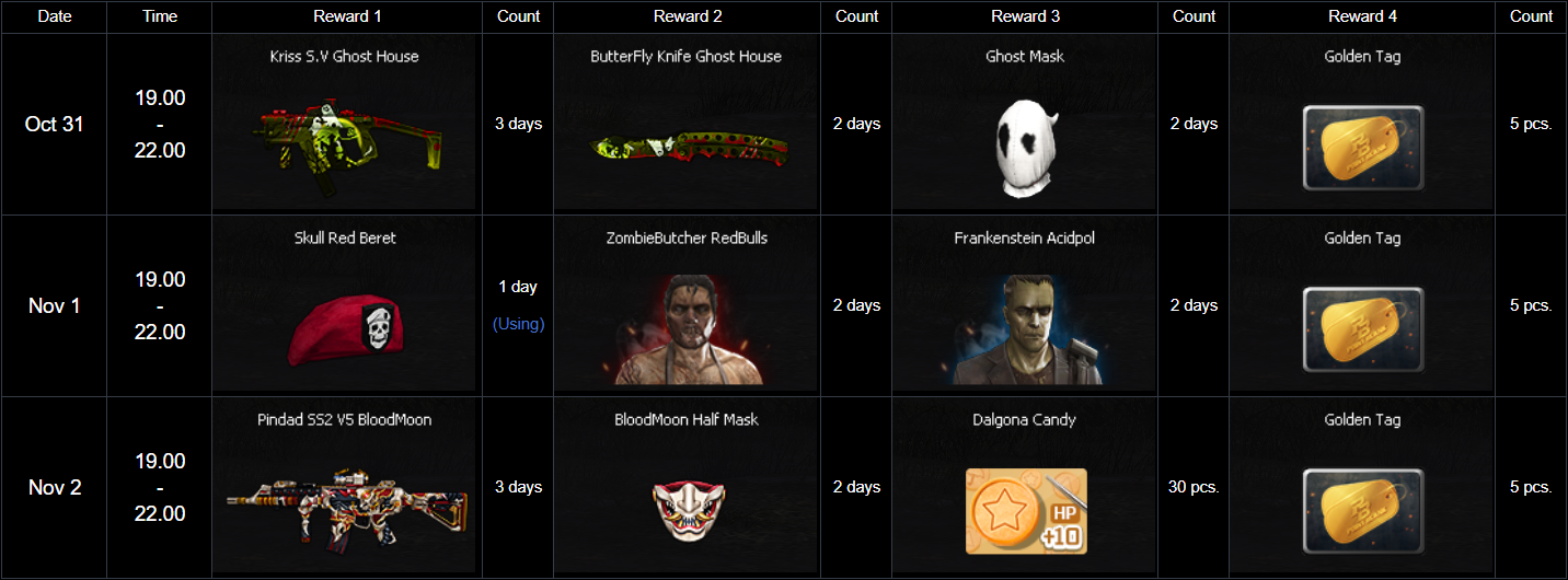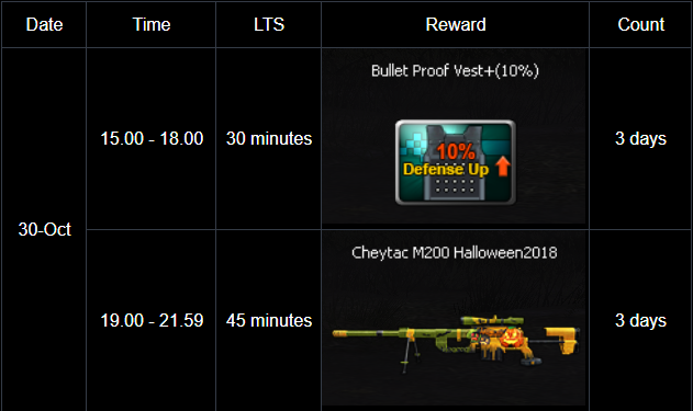 ========================= Weekend Login Time Spend Event Event Period: October 30 - November 2, 2025 Simply log in and accumulate the required number of online hours during the "Event Period" to receive the following rewards. ![]() ![]() ![]() ![]() ========================= ![]() Halloween Special Attendance Schedule Event Period: October 22 - November 4, 2025 Just log in to the game during the event to receive the following items. ![]() ![]() EXP & Point Bonus Table for October 2025 ![]() EXP & Point Bonus Table for November 2025 ![]() ![]() |