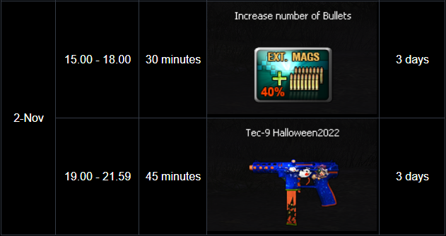 POINT BLANK SERVER MAINTENANCE October 29, 2025 Highlights Ready to take off! Battle Pass: Aero Strike Corp are available today! See more details here. Get scared! The Halloween 2025 event with more exclusive reward awaiting! See more details here. October 2025 Bullet Token Random box & Gold Ticket Exchange See more details here. New In-game Update New! Blue Beanie Blond Wig Dura Box Sale (October 29 - November 1, 2025) New! Weekend Special Login Event (October 31 - November 2, 2025) New! Weekend Login Time Spend Event (October 30 - November 2, 2025) Current ongoing activities - Welcome New Player Event (October 22 - November 4, 2025) - Daily Login Event (October 22 - November 4, 2025) - Mission Card: Aero Strike Corps (October 22 - November 4, 2025) - Halloween Special Attendance (October 22 - November 4, 2025)