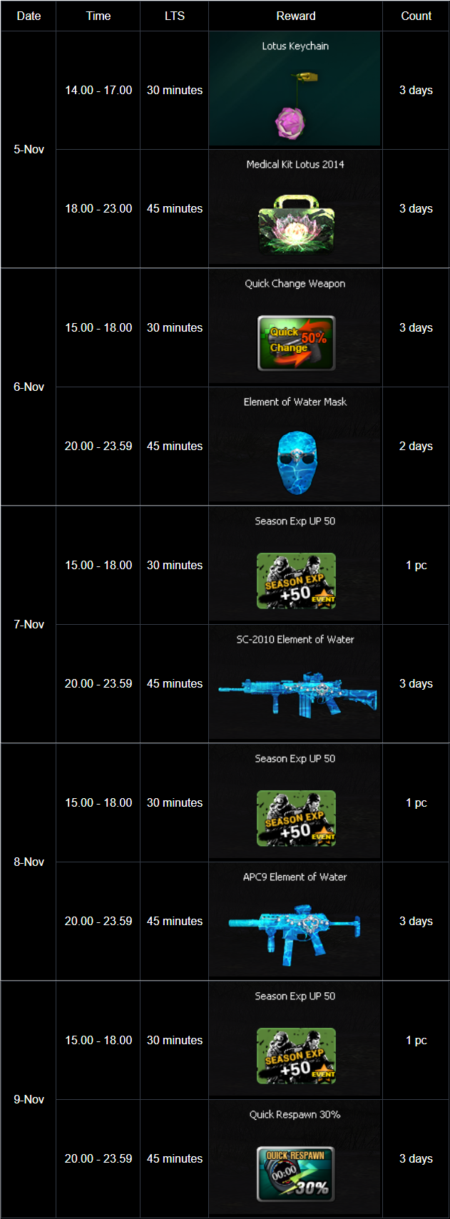 Player who online in game for the determined dates and times. Received "Exclusive items" for Free!