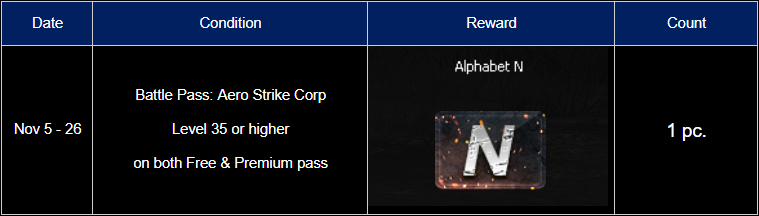 1. 3. Battle Pass: Aero Strike Corps Level 35+ (Alphabet N)