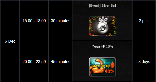 Event Period: December 3 - 16, 2025 Before In the normal server, you will earn Clan Medals equivalent to 1% of the EXP you receive. For example: 100 EXP = 1 Clan Medal *You cannot simply log in and receive Clan Medals from logging in based on time. After In the normal server, you will earn Clan Medals equivalent to 5% of the EXP you receive. For example: 100 EXP = 5 Clan Medals *You can also earn Clan Medals just by logging in, up to get 5 Medals per 30 minutes. ========================= ![]() Winter Attendance Event period : December 3 - 16, 2025. Just log in to the game during the event to receive special items. Players can check the item list inside the attendance menu. ![]() ![]() EXP & Point Bonus Table for December 2025 ![]() ![]() |