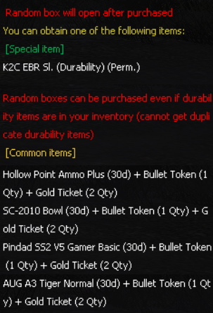 For each "K2C EBR Sl Durability Box" opened, player will receive 1 Bullet Token and 2 Gold Ticket