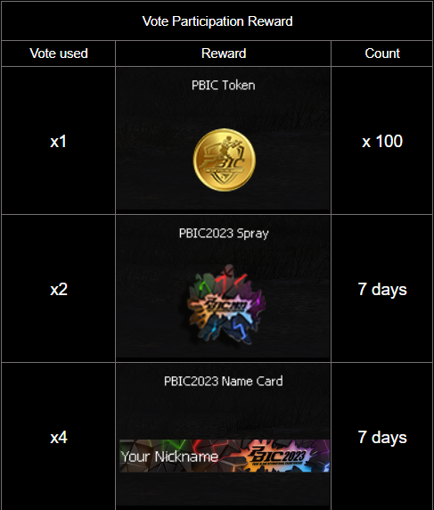 ===Lucky Vote Reward=== Lucky draw reward to get Exclusive reward for the participant who able to guess the PBIC 2026 champion correctly!