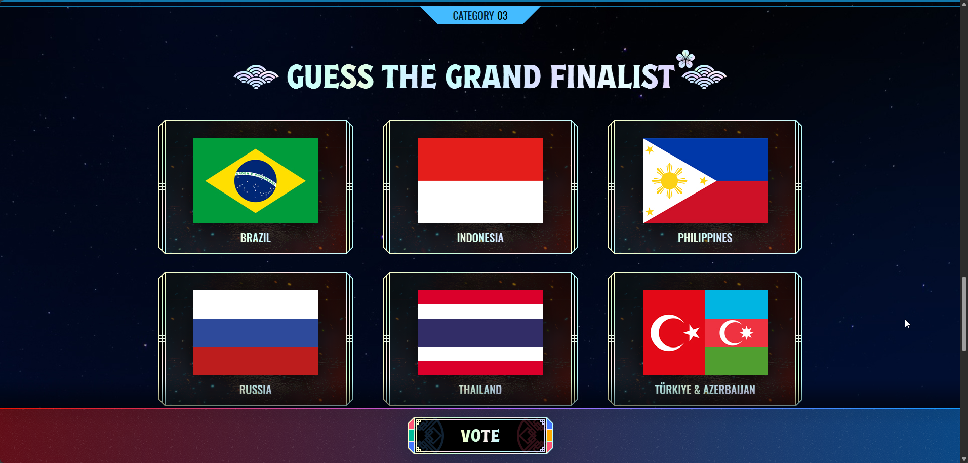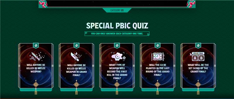 ===== Voting Guide ===== The Voting Event Categories are divided as follows Remark: Please be aware that each vote must use 10 of "PBIC Ticket Vote" Vote Item 1.1 PREDICTION QUIZ WITH FIVE PARTS - Answer the prediction of each Quiz. (For the Special PBIC QUIZ Part, only one prediction per Quiz is allowed.) 1.2 GUESS THE TOP 4 - predict the Nation Team that will access to Semi - Final Round (Available for multiple predictions to increase your chances of winning) 1.3 GUESS THE GRAND FINALISTS - Predict the Nation Team that will access to Grand Final Round (Available for multiple predictions to increase your chances of winning)
