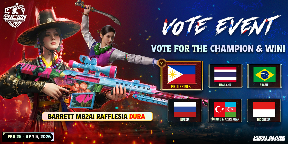 PBIC 2026 Vote Event Event Period: February 25 - April 5, 2026 Welcome to the ultimate Point Blank Tournament of the year! Participate in our Special Vote Event for a chance to win the grand prize – a Durability Weapon! Don't miss out on this incredible opportunity!