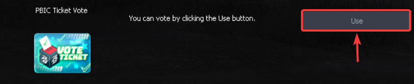 ===== Voting Condition ===== 1. Players can access the PBIC Voting Window via: Inventory > Items 2. 10 EA of in-game Item "PBIC Ticket Vote" is required for each vote.
