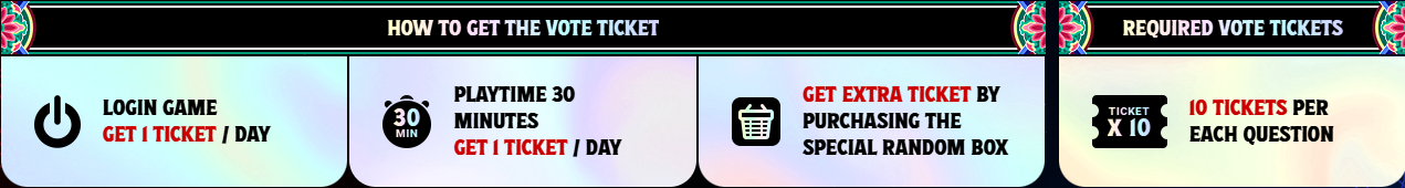 The Voting Event Prize are divided into 3 parts as follows === Participation Vote Reward === Every player who participates this event at least 1 times vote will be obtained as follows. PBIC Token 10 EA
