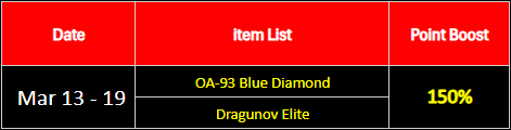 Use the series' main weapon to receive a special EXP & Point bonus of 150% during the event (Bonus period: March 11 - 17, 2026) ========================== Limited Point Item Sale Sale period : March 13 - 15, 2026. Opening for new limited item sale which can be purchase via Point for all players! You can purchase more item more comfortable. List of special discount item for limited time can be purchase with Point