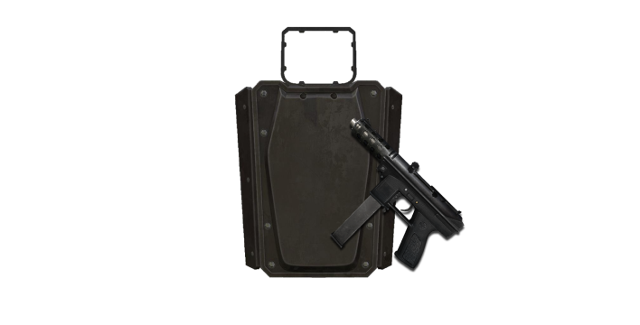 The Tactical Shield Tec-9 allows players to use a shield and a Tec-9 pistol simultaneously, replacing the primary weapon. It supports bothhip-fire and aimed shooting. The shield blocks bullets and explosionsfrom all directions except the gun-holding hand, head line, both shouIder ends, and below the thighs. While vulnerable to side and rear attacks, it can defend from the front and partially from the sides whileallowing firearm use.