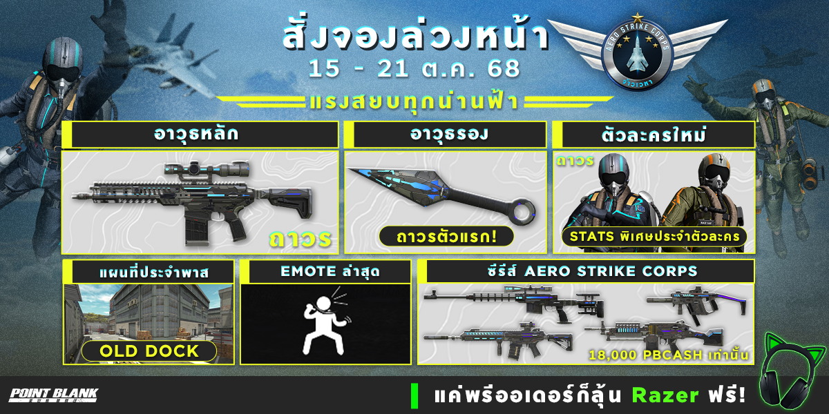 Season Exp UP 1,000 (ขึ้นเลเวล Battle Pass ไปเลเวล 17 ทันที) ผู้เล่นที่ Pre-order Battle Pass: Aero Strike Corps ล่วงหน้ามีสิทธิ์ลุ้นรับของรางวัลจาก "กิจกรรม PB x Razer" ลุ้นรับเกมมิ่งเกียร์จาก Razer ได้เลยเมื่อซื้อตั๋วจอง สามารถอ่านรายละเอียดเพิ่มเติมได้ที่นี่ ขั้นตอนการ Pre-order 1. ทำการซื้อ "ตั๋วจอง Battle Pass ล่วงหน้า" ซึ่งเปิดจำหน่ายที่ IN-GAME SHOP ผู้เล่นสามารถตรวจสอบได้ที่หมวดหมู่ไอเท็ม (ITEM) เพื่อทำการซื้อ "ตั๋วจอง Battle Pass ล่วงหน้า" (ภาพตัวอย่าง "ตั๋วจอง Battle Pass ล่วงหน้า") 2. หลังจากซื้อและครอบครองไอเท็ม "ตั๋วจอง Battle Pass ล่วงหน้า" เรียบร้อยแล้ว ระบบจะทำการเปลี่ยนไอเท็มดังกล่าวเป็น Premium Battle Pass เมื่อ Battle Pass ใหม่ถูกอัปเดตเข้าเซิฟเวอร์ 3. เมื่อได้รับ Premium Battle Pass เรียบร้อย "ตั๋วจอง Battle Pass ล่วงหน้า" จะทำการลบออกจากกระเป๋าสัมภาระผู้เล่นทันที ระยะเวลาการเปิด Pre-Order: 15 - 21 ตุลาคม 2568 และ วันที่ได้รับ Premium Battle Pass : 22 ตุลาคม 2568 ไฮไลต์ของรางวัล Battle Pass : Aero Strike Corps อาวุธหลัก : XM7 Aero Strikes Corps (ถาวร) [XM7 Aero Strike Corps (ถาวร) จะได้รับจาก Battle Pass Premium Level 45] อาวุธประชิด : Kunai Aero Strike Corps (ถาวร) [Kunai Aero Strike Corps (ถาวร) จะได้รับจาก Battle Pass Premium Level 40] ตัวละคร Battle Pass: Aero Strike Corp Caimangrey [Normal] และ Aero Strike Corp Wolf [Normal] Aero Strike Corps Caimangrey [Normal] [ถาวร] (HP 100) [ ได้รับจาก Battle Pass Premium Level 1 ] Aero Strike Corps Wolf [Normal] [ถาวร] (HP 100) [ จะได้รับจาก Battle Pass Premium Level 1 ] ========================== Aero Strike Corps Name Card & Master Name Card & Aero Strike Corps Spray