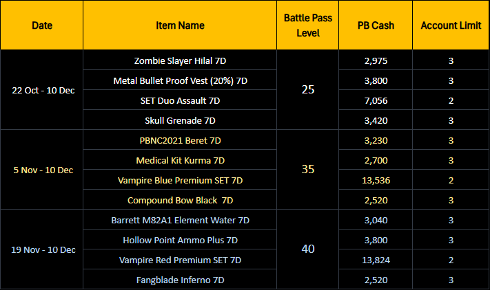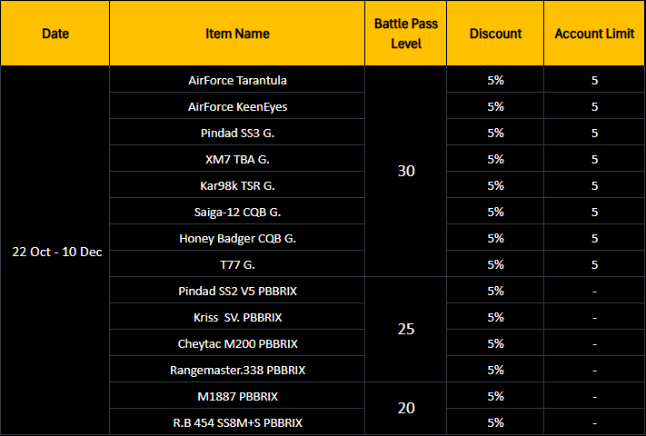 สำหรับผู้เล่นที่ ยังไม่ได้ซื้อ Battle Pass สามารถเลือกซื้อไอเทมราคาพิเศษได้ใน Battle Pass Shop รายชื่อไอเทม (สำหรับผู้เล่นสายฟรีเท่านั้น)
