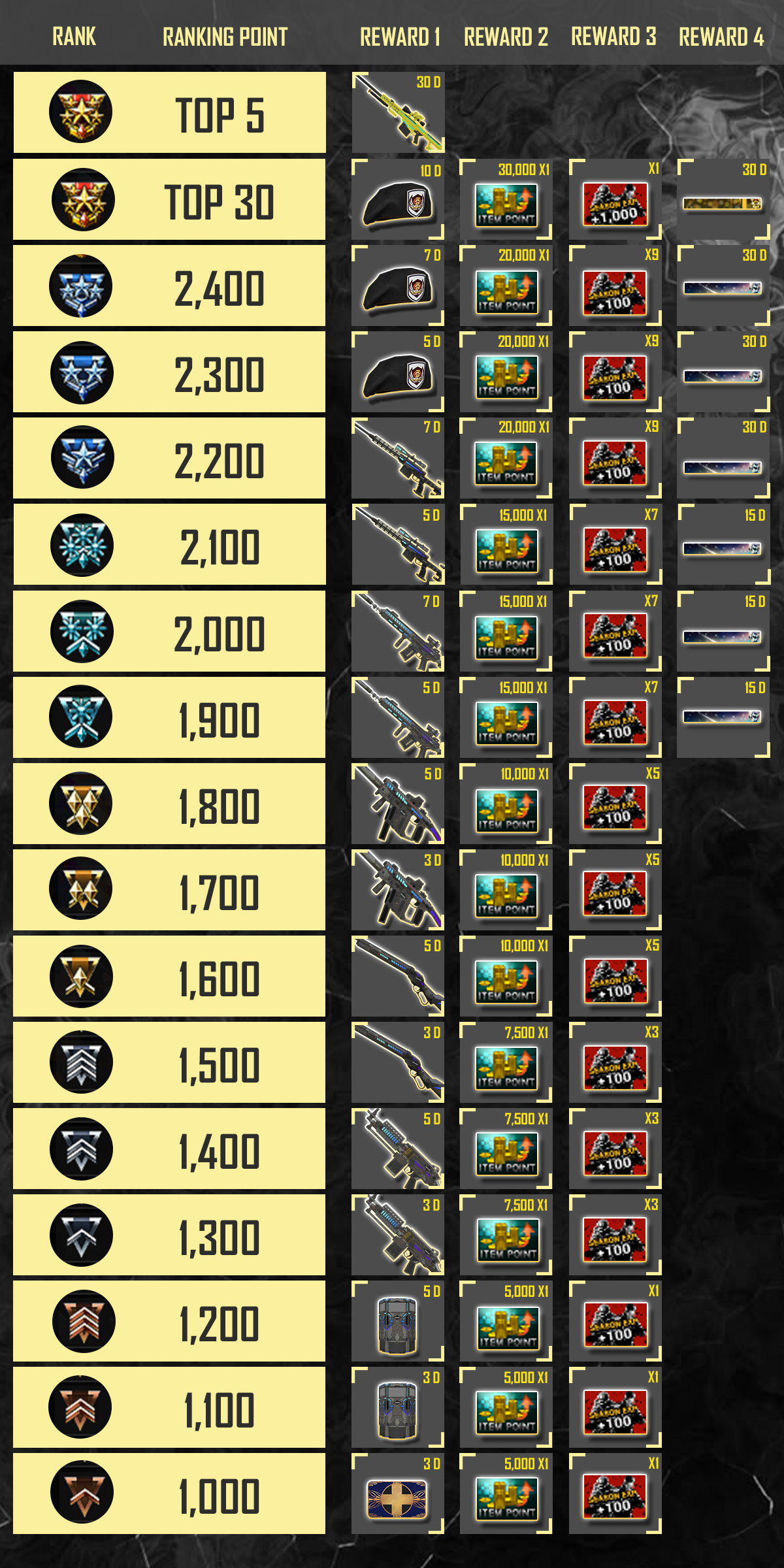** ผู้เล่นที่จะ Top 30 ต่อเมื่อผู้เล่นมีคะแนนสะสมมากกว่า 2,400 คะแนนเท่านั้น