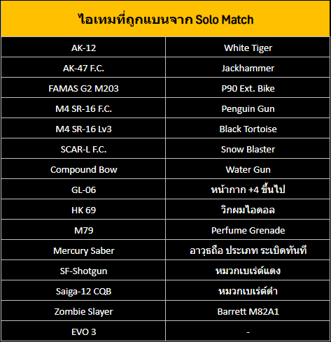 รายชื่อไอเทมที่ถูกห้ามใช้ในการเล่น Solo Match
