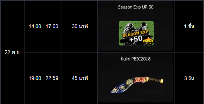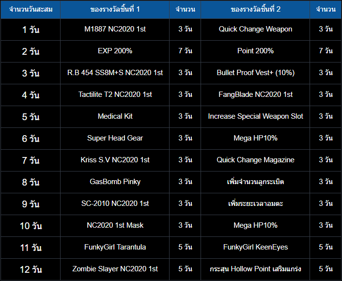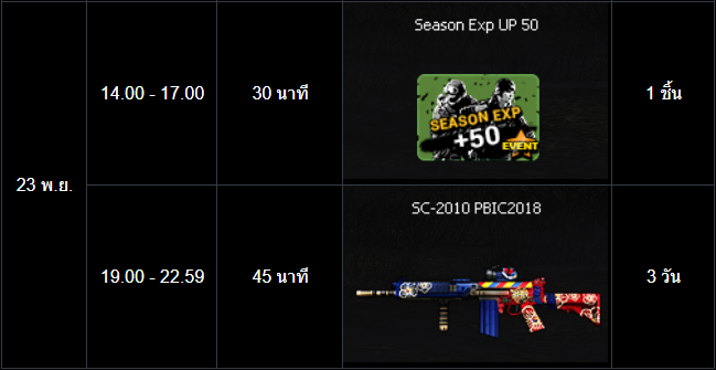 * ไอเทมทุกชิ้นจากกิจกรรมจะมีอายุการใช้งาน 1 วัน* **ไอเทมจะถูกเปิดใช้งานทันทีเมื่อเข้าตัวหรืออยู่ในคลังอาวุธของผู้เล่น**