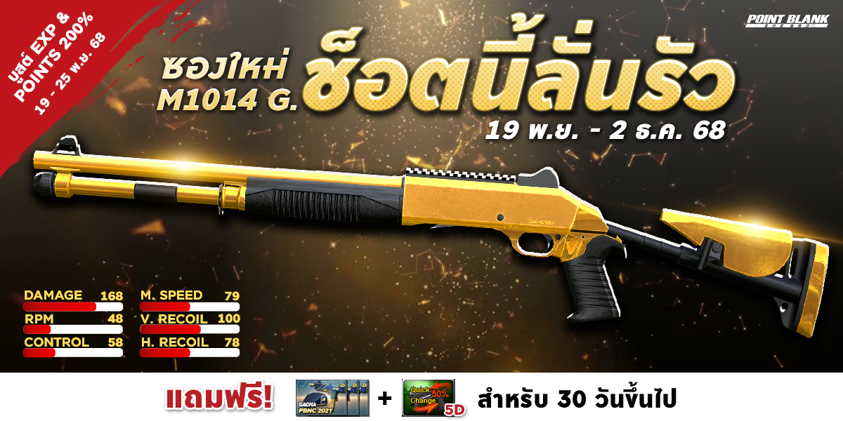 POINT BLANK WEEKLY EVENT UPDATE อัปเดตประจำวันที่ 19 พฤศจิกายน 2568 ไฮไลท์อัปเดตประจำสัปดาห์ 3. โหมด Hardcore Bomb เอาใจสายสมจริง จริงจังขั้นสุด! พร้อมกับกิจกรรมสุดท้าทาย ดูรายละเอียดเพิ่มเติมที่นี่ กิจกรรมใหม่ภายในเกม << ลูกซองใหม่พร้อมระเบิดสนามรบ! M1014! >> ![]() อัปเดต กิจกรรม แจกของรางวัลต้อนรับผู้เล่นใหม่! (19 พฤศจิกายน - 2 ธันวาคม 2568) อัปเดต กิจกรรม ล็อกอินรับไอเทมประจำวัน! (19 พฤศจิกายน - 2 ธันวาคม 2568) อัปเดต กิจกรรม การ์ดภารกิจ Aero Strike Corps 3 (19 พฤศจิกายน - 2 ธันวาคม 2568) อัปเดต กิจกรรม สะสมเวลาล็อกอินสุดสัปดาห์ (21 - 23 พฤศจิกายน 2568) อัปเดต กิจกรรม PBNC Stage Boost (19 พฤศจิกายน 2568) อัปเดต กิจกรรม ล็อกอินต่อเนื่อง ประจำเดือนพฤศจิกายน (19 - 25 พฤศจิกายน 2568) กิจกรรมที่กำลังดำเนินอยู่ภายในเกม กิจกรรม ล็อกอินต่อเนื่อง สำหรับผู้เล่นหวนคืน (12 - 25 พฤศจิกายน 2568) ![]() M1014 G. ระยะเวลากิจกรรม: 19-25 พฤศจิกายน 2568 สำหรับผู้เล่นที่ซื้อ M1014 G. เป็นจำนวน 30 วันขึ้นไปรับไอเทม PBNC 2021 Gacha x3 Quick Change Weapon 5 วัน