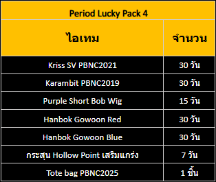 1. *หลังจากการซื้อ ผู้เล่นจะได้รับไอเทม Golden Ticket เป็นตัวแทน Lucky Pack (ไอเทมจะถูกลบออกจากกระเป๋า 7 วันทำการหลังจบกิจกรรม)