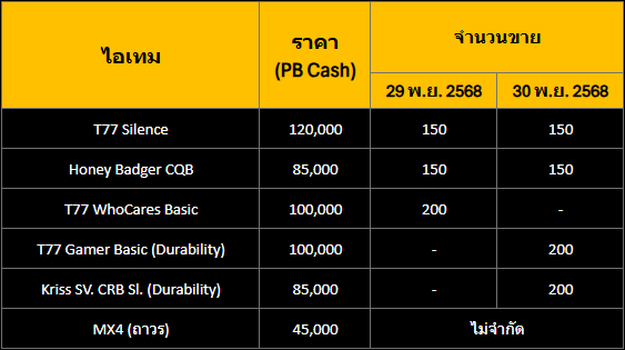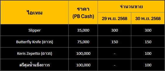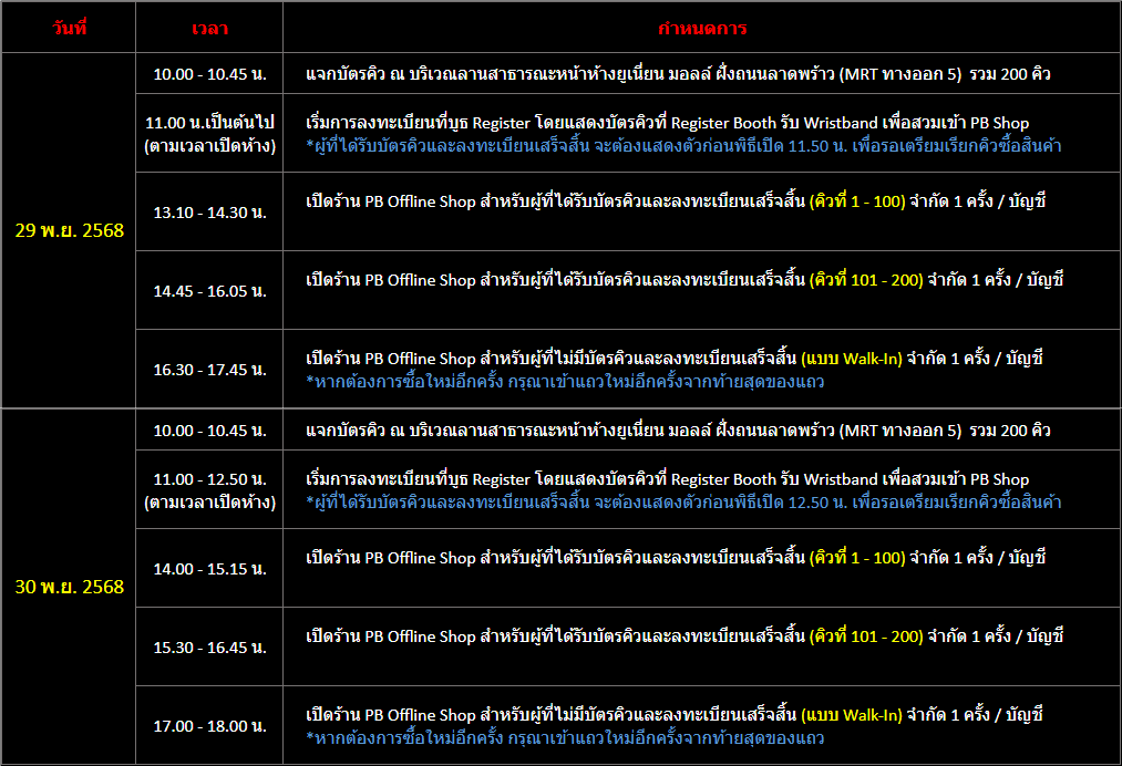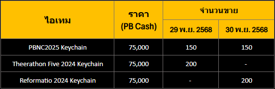 2. สินค้าจะถูกจำหน่ายที่ บูธ PB SHOP ณ งานแข่งขัน PBNC2025 ในวันที่ 29 และ 30 พฤศจิกายน 2568 เท่านั้น