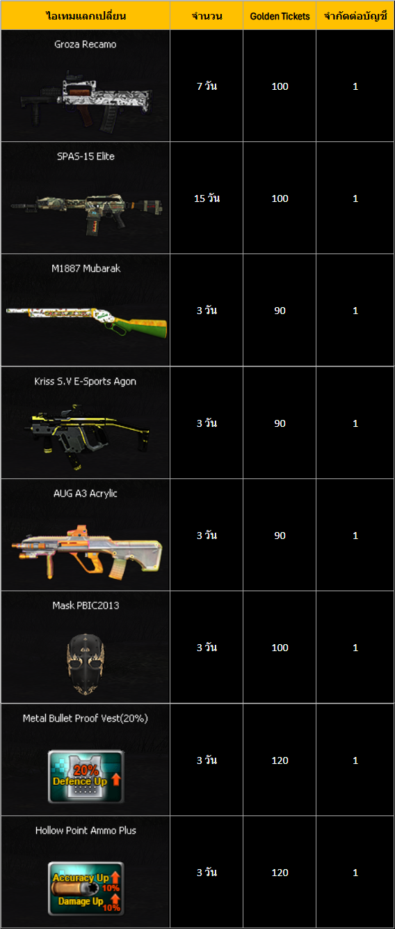 3.ไอเทมถาวรสามารถแลกเข้าไอดีที่มี Gold Ticket เท่านั้น ไม่สามารถโอนย้ายไปยังไอดีอื่นได้