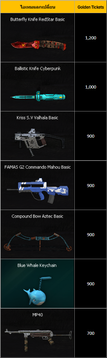 (Gold Ticket รับได้จากกล่องสุ่มปืนถาวร และ กิจกรรมภายในเกม)