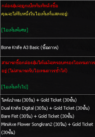 *ทุกกล่องสุ่ม [ Boneknife A3 Basic Dura Box ] จะได้รับ Gold Ticket จำนวนเดียวกับจำนวนวันที่ได้รับไอเทม*