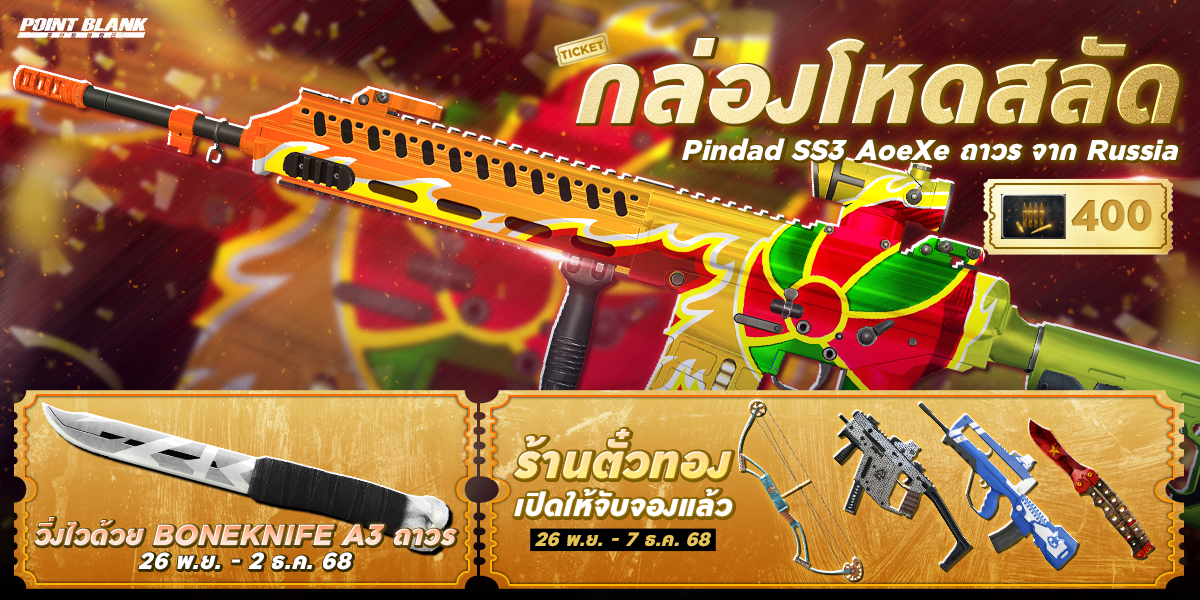 หลังสิ้นสุดกิจกรรม ผู้เล่นที่มีจำนวน Bullet Token 400 ชิ้นหรือมากกว่าและยังไม่ได้รับ Pindad SS3 AoeXe Basic (Durability)
