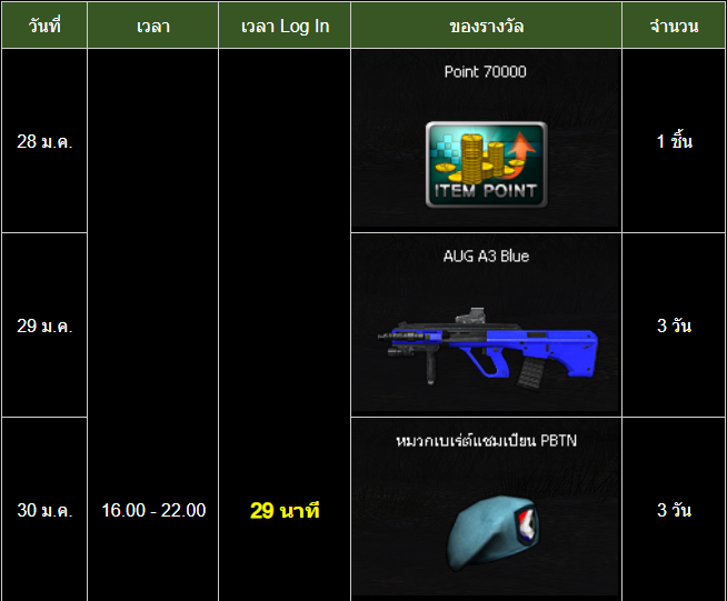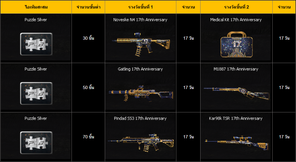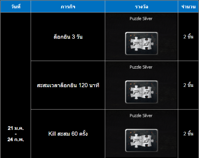 รางวัลจะได้รับตามจำนวน Silver Puzzle ที่สะสมได้ เช่น ผู้เล่นมีจำนวน Silver Puzzle ทั้งหมด 70 ชิ้น ผู้เล่นจะได้รางวัลทั้งหมดตั้งแต่ระดับ 30 ชิ้น จนถึง 70 ชิ้น หมายเหตุ: รางวัลพิเศษจะถูกส่งให้ในกระเป๋าสัมภาระผู้เล่นภายใน 7 วันทำการ ===========================
