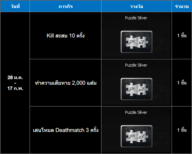 ภารกิจรับ Sliver Puzzle เควสรายวันและรายสัปดาห์ ระยะเวลากิจกรรม : 21 มกราคม - 24 กุมภาพันธ์ 2569 เควสรายวันและรายสัปดาห์พิเศษ เพียงเข้าไปทำเควสให้สำเร็จและสามารถทำได้ตลอดระยะเวลากิจกรรม! รับรางวัลเมื่อทำภารกิจสำเร็จพร้อมรับ Silver Puzzle ให้สะสมรับของรางวัลเพิ่มเติมอีกด้วย!! รายชื่อเควสรายวัน