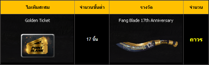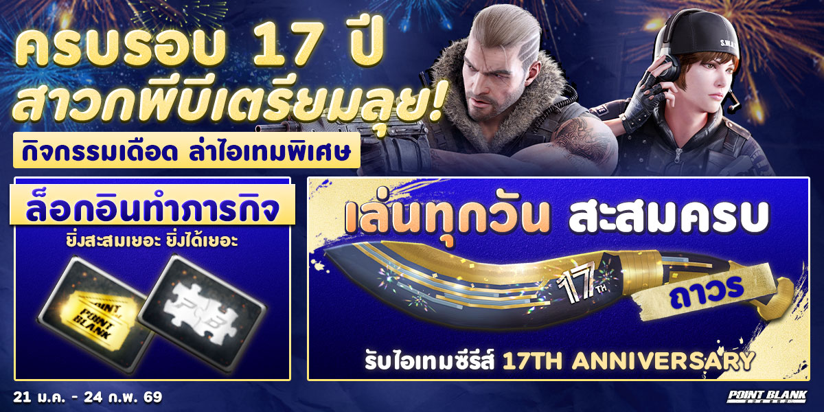 กิจกรรมพิเศษครบรอบ 17 ปี Point Blank! สำหรับผู้เล่นทุกคน เวลากิจกรรม : 21 มกราคม - 24 กุมภาพันธ์ 2569 ขอต้อนรับผู้เล่นทุกท่านสู่กิจกรรมใหญ่ต้นปี 2569 เกม Point Blank ได้เริ่มเปิดให้บริการมานานถึง 17 ปี เปิดประสบการณ์ความสนุกสุดมันส์ให้กับผู้เล่นมายาวนาน พวกเราทีมงานขอขอบคุณผู้เล่นทุกคนที่เป็นส่วนหนึ่งในความสำเร็จ และ ได้เตรียมกิจกรรมสุดพิเศษมากมายให้กับทุกคน ให้ได้ร่วมสนุกตลอดทั้งเดือนกับของรางวัลมากมาย ทั้งนี้ยังมีกิจกรรม สะสมตั๋ว Golden Ticket และ Silver Puzzle เพื่อรับของรางวัลสุดพิเศษ และสิทธิในการลุ้นรับของรางวัลใหญ่เมื่อเก็บสะสมจนครบ! รายละเอียดการอัปเดตและกิจกรรม ภารกิจรับ Sliver Puzzle - เควสรายวันและรายสัปดาห์ (21 มกราคม - 24 กุมภาพันธ์ 2569) - เควสรายวันพิเศษปลดล็อคด้วย PB Cash (28 มกราคม - 17 กุมภาพันธ์ 2569) - ล็อกอินต่อเนื่อง ครั้งที่ 1 (21 มกราคม - 3 กุมภาพันธ์ 2569) - ล็อกอินต่อเนื่อง ครั้งที่ 2 (4 - 17 กุมภาพันธ์ 2569) ภารกิจรับ Golden Ticket - สะสมเวลาเล่นเกมรายวัน (21 มกราคม - 24 กุมภาพันธ์ 2569) - เควสรายสัปดาห์พิเศษปลดล็อคด้วย PB Cash (4 - 24 กุมภาพันธ์ 2569) กิจกรรมพิเศษ - สะสมเวลาล็อกอิน 1700 วินาที (28 มกราคม - 1 กุมภาพันธ์ 2569) - บูส EXP & Point ตามลำดับยศ (23 มกราคม - 22 กุมภาพันธ์ 2569) รางวัลใหญ่พิเศษสำหรับกิจกรรม 17 ปี - รางวัลพิเศษสำหรับผู้เล่นปัจจุบัน - รายชื่อรางวัลสุดพิเศษเมื่อสะสม Golden Ticket และ Silver Puzzle ครบจำนวน!