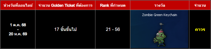 *ไอเทมประดับ Zombie Green Keychain สามารถซ่อมได้ด้วย Point **ไอเทมจะถูกส่งเข้ากระเป๋าสัมภาระผู้เล่นหลังสิ้นสุดกิจกรรม ภายใน 7 วันทำการ =========================== รางวัลสำหรับผู้เล่นที่สะสม Golden Ticket ครบตามกำหนด สำหรับผู้เล่นที่สะสม Golden Ticket ได้ครบ 17 ชิ้น จะได้รับไอเทมพิเศษหลังสิ้นสุดกิจกรรม