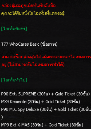 *ทุกกล่องสุ่ม [ T77 WhoCares Ba Durability Box ] จะได้รับ Gold Ticket จำนวนเดียวกับจำนวนวันที่ได้รับไอเทม*