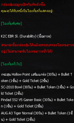 1. * ทุกกล่องสุ่ม K2C EBR Sl Durability Box จะได้รับ Bullet Token 1 ชิ้น และ Gold Ticket 2 ชิ้น