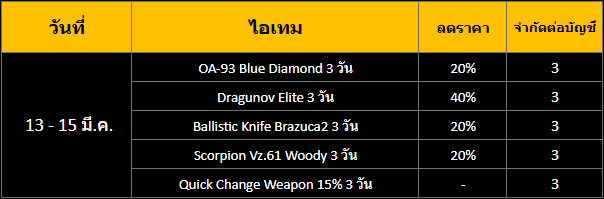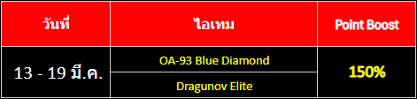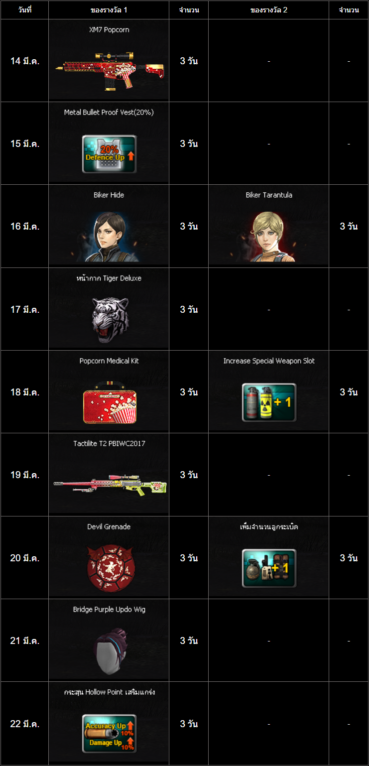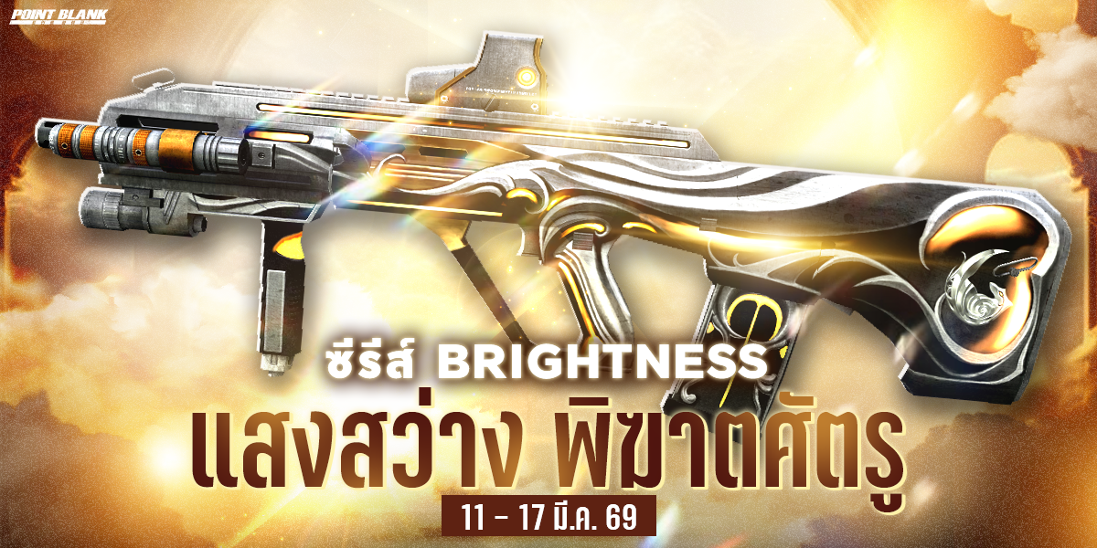 POINT BLANK WEEKLY EVENT UPDATE อัปเดตประจำวันที่ 11 มีนาคม 2569 รายละเอียดการอัปเดตประจำสัปดาห์ ไฮไลท์กิจกรรม 1. Season Pass: PBIC2026 Shaman ต้อนรบเทศกาลการแข่ง PBIC2026 พร้อมเล่นแล้ววันนี้ - 15 เมษายน ดูรายละเอียดเพิ่มเติมที่นี่ 2. กิจกรรมสะสม Token แลกไอเทมสุดพิเศษประจำงานแข่ง PBIC 2026 ได้เริ่มต้นแล้ววันนี้! 2. ฤดูกาลแข่งขัน Solo Matchmaking ประจำ Season Pass: PBIC2026 Shaman ได้เริ่มต้นตั้งแต่วันนี้ - 12 เมษายน 2569 กิจกรรมใหม่ภายในเกม อัปเดต กิจกรรม Point Item Sale (13 - 15 มีนาคม) อัปเดต กิจกรรม แจกของรางวัลต้อนรับผู้เล่นใหม่ (11 - 24 มีนาคม) อัปเดต กิจกรรม บูส EXP และ Point เฉพาะโหมด Solo Match (11 - 24 มีนาคม) อัปเดต กิจกรรม ล็อกอินสุดสัปดาห์รับ Token PBIC 2026 (13 - 29 มีนาคม) อัปเดต กิจกรรม สะสมเวลาล็อคอินสุดสัปดาห์ PBIC2026 (13 - 15 มีนาคม) อัปเดต กิจกรรม นับถอยหลัง PBIC (14 - 22 มีนาคม) กิจกรรมที่กำลังดำเนินอยู่ภายในเกม กิจกรรม สะสมเวลาเล่น PBIC 2026 (25 กุมภาพันธ์ - 24 มีนาคม) กิจกรรม ล็อกอินรายวันรับตั๋วโหวต PBIC 2026 (4 - 24 มีนาคม) ![]() Brightness ซีรีส์ ระยะเวลาเปิดจำหน่ายตั้งแต่วันที่ : 11 - 18 มีนาคม (ไอเทมจะทำการเปิดจำหน่ายจนถึงระยะเวลาก่อนปิดปรับปรุงเซิร์ฟเวอร์) "พิเศษโบนัส 150% EXP & Point เมื่อใช้อาวุธหลักของซีรีส์" ![]() ![]() ![]() ==========================