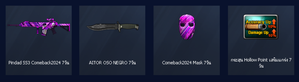 เซ็ต Pindad SS3 Comeback2024 Package 7D ระยะเวลาเปิดจำหน่ายตั้งแต่วันที่ : 11 - 24 มีนาคม (ไอเทมจะทำการเปิดจำหน่ายจนถึงระยะเวลาก่อนปิดปรับปรุงเซิร์ฟเวอร์)